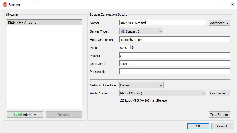 pidfile = "/run/rtl_airband.pid"; devices = ( { // Set device to scanning mode if you are scanning multiple frequencies mode = "scan"; ... channels = ( { // Set the frequency you are scanning freq = 123000000; // Or if you are in scanning multiple frequencies freqs = ( 123000000, 123500000 ); ... outputs = ( // Example configuration for AirNav Radar { disable = false; type = "icecast"; server = "audio.rb24.com"; port = 8000; mountpoint = "EXTVHFXXXXXX"; username = "my@email.com"; password = "*********"; name = "My Transmitter"; genre = "ATC"; send_scan_freq_tags = true; }, // Example configuration for LiveATC { disable = false; type = "icecast"; server = "audio-in.liveatc.net"; port = 8010; mountpoint = "XXXXXXX; username = "XXXXXX"; password = "XXXXXX"; name = "My Transmitter"; genre = "ATC"; send_scan_freq_tags = true; } ); } ); } );Windows PC (click to expand)